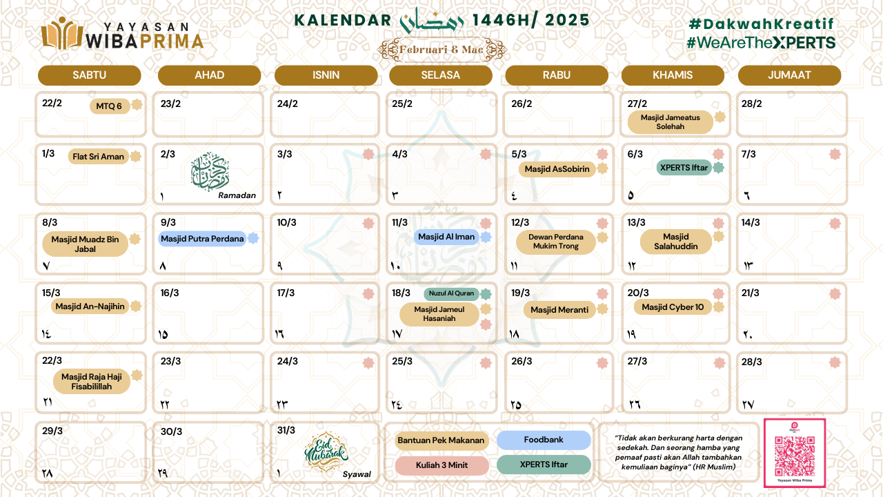 Yayasan WIBA PRIMA (YWP), the NGO/CSR affiliate of XPERTS.MY, drives impactful education, welfare, and #dakwahkreatif initiatives for Malaysians. In collaboration with XPERTS, the FOODBANK program provides essential aid to underprivileged families across Klang Valley masjids, including Masjid Raja Haji Fi Sabilillah, Masjid Cyber10, and Masjid Jameatus Solehah Dengkil. Meanwhile, Social Aids for Young Aspirants (SAYAP) empowers youth through early childhood development support at Axon Children’s Centre, Cyberjaya. The annual Ihya' Ramadan Program supports asnaf and orphans nationwide during Ramadan. These initiatives are part of our #dakwahkreatif efforts to give back and uphold #WeAreTheXPERTS spirit.